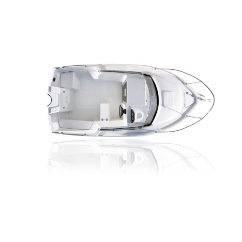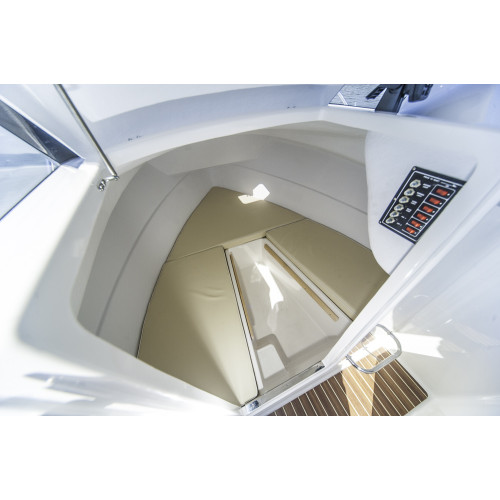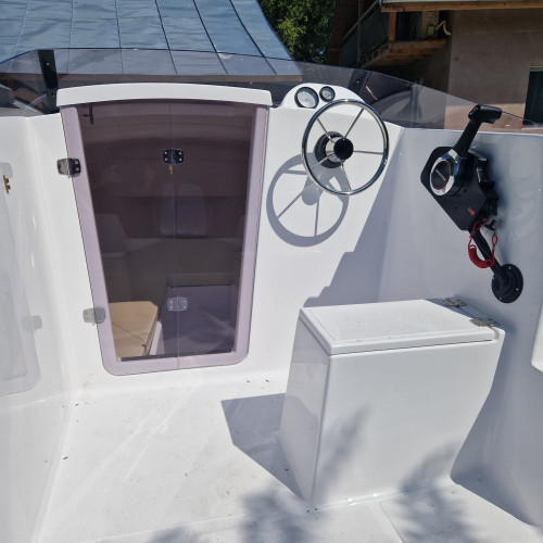 O caracteristică distinctivă a acestei bărci este cabina sa confortabilă, care oferă două locuri de dormit, subliniind astfel aspectul său practic și versatil. Cabina spațioasă nu numai că asigură un loc plăcut pentru odihnă, dar oferă și posibilitatea de a petrece nopțile pe apă în confort. Această caracteristică face ca barca să fie ideală pentru aventuri mai lungi sau pentru camping pe apă.